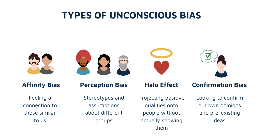 The graphic below highlights four common types of implicit bias that often affect the workplace, education, health care, and justice systems. Once we recognize the biases we hold, we can strive to actively change the way we think, challenging the negative or harmful preconceptions our culture may have instilled in our brains.