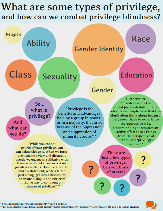 We commonly hear about privilege based on race or gender, but privilege can also encompass religion, sexuality, ability, class, and education. It is important to remember that aspects of an individual’s identity, as well as various forms of inequality, often operate and conflict with each other.